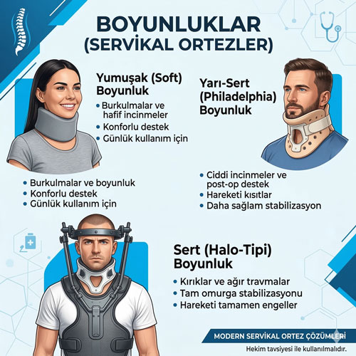 Servikal ortezler, başın ağırlığını omuzlara aktararak boyun omurlarındaki baskıyı azaltmak, hareketleri kısıtlamak ve iyileşme sürecini stabilize etmek için kullanılan medikal yardımcı cihazlardır.